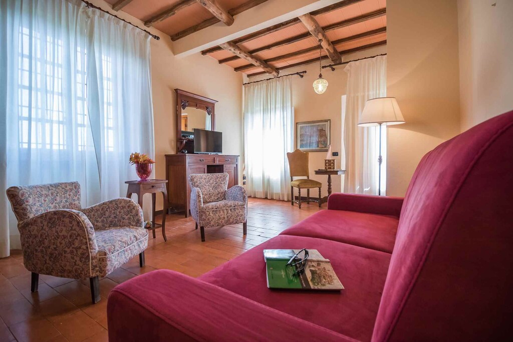 Per il vostro comfort all’esterno troverete due zone living con lettini, sedie e poltrone dove potrete gustarvi un buon bicchiere di vino rosso toscano mentre ammirate il panorama nitido all’orizzonte.