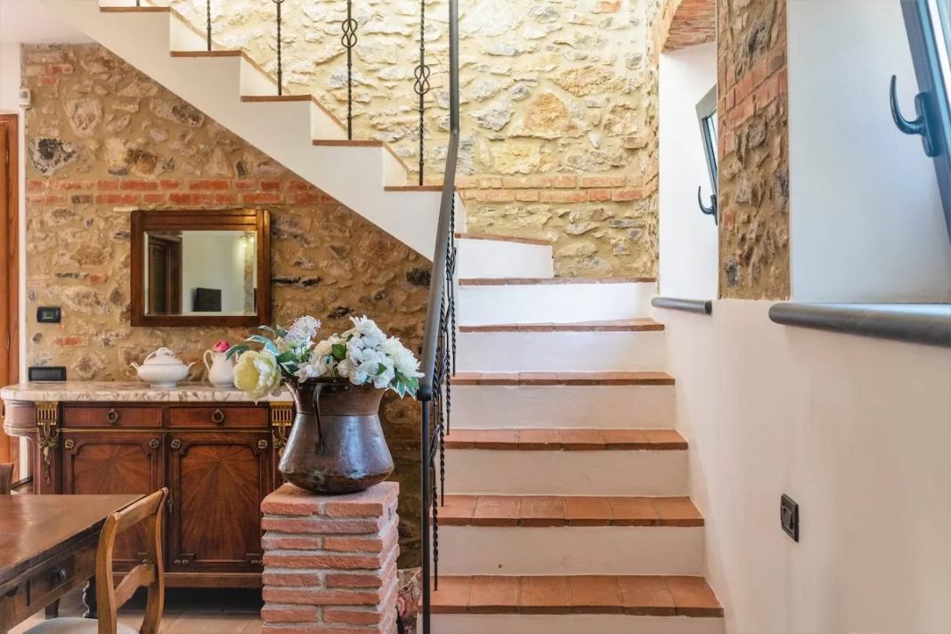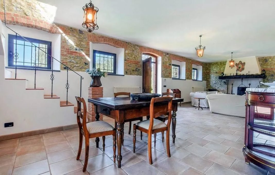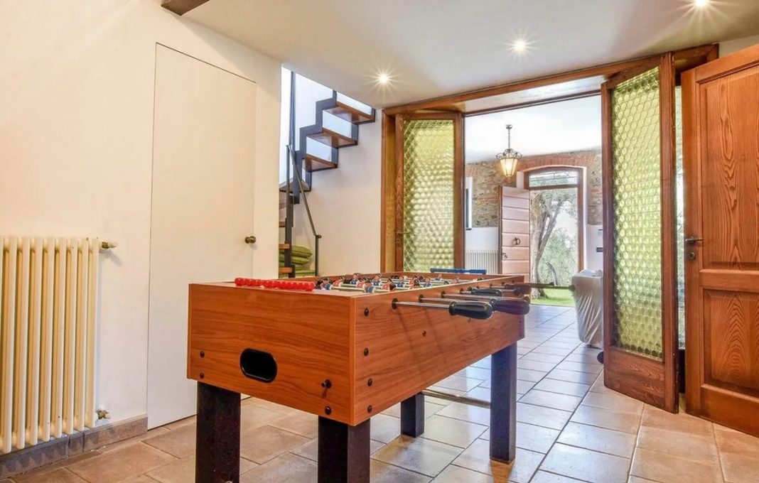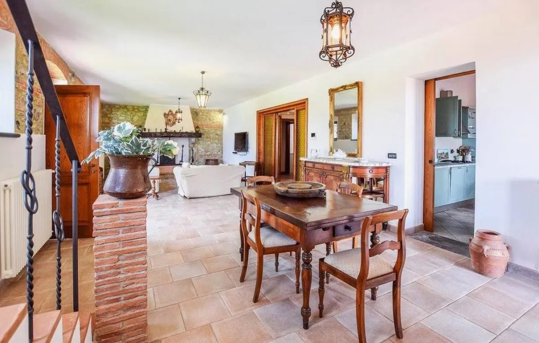L’edificio è disposto su due piani. Al piano terra si trova un ampio soggiorno con camino, TV a schermo piatto e una spaziosa zona pranzo, una cucina completamente attrezzata (forno, frigo-congelatore, lavastoviglie, moka, caffettiera americana, tostapane, bollitore, forno a microonde), una stanza con calcio balilla, un bagno con doccia. Dalle porte-finestre della cucina si accede alla splendida veranda, dotata di barbecue in muratura e forno a legna, affacciata sulla piscina.