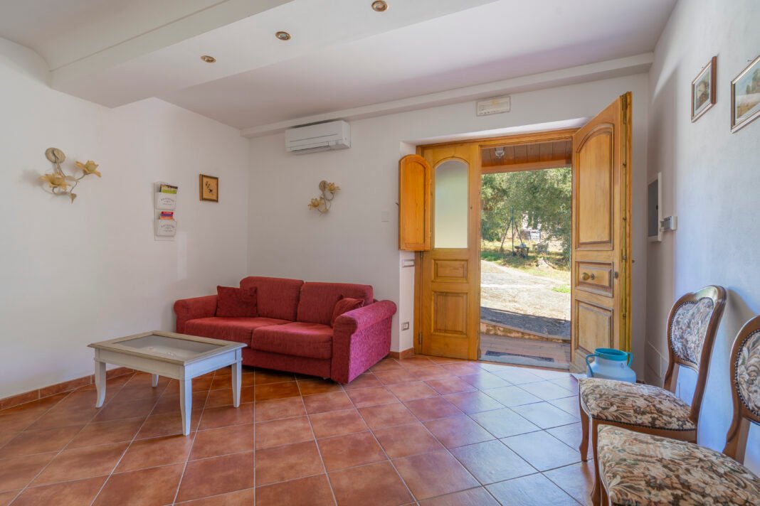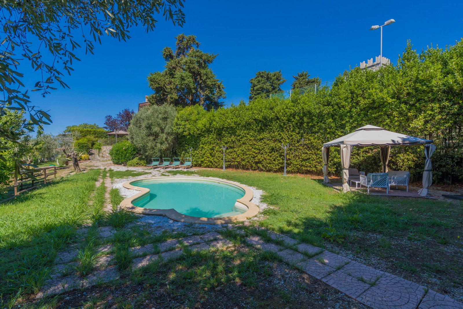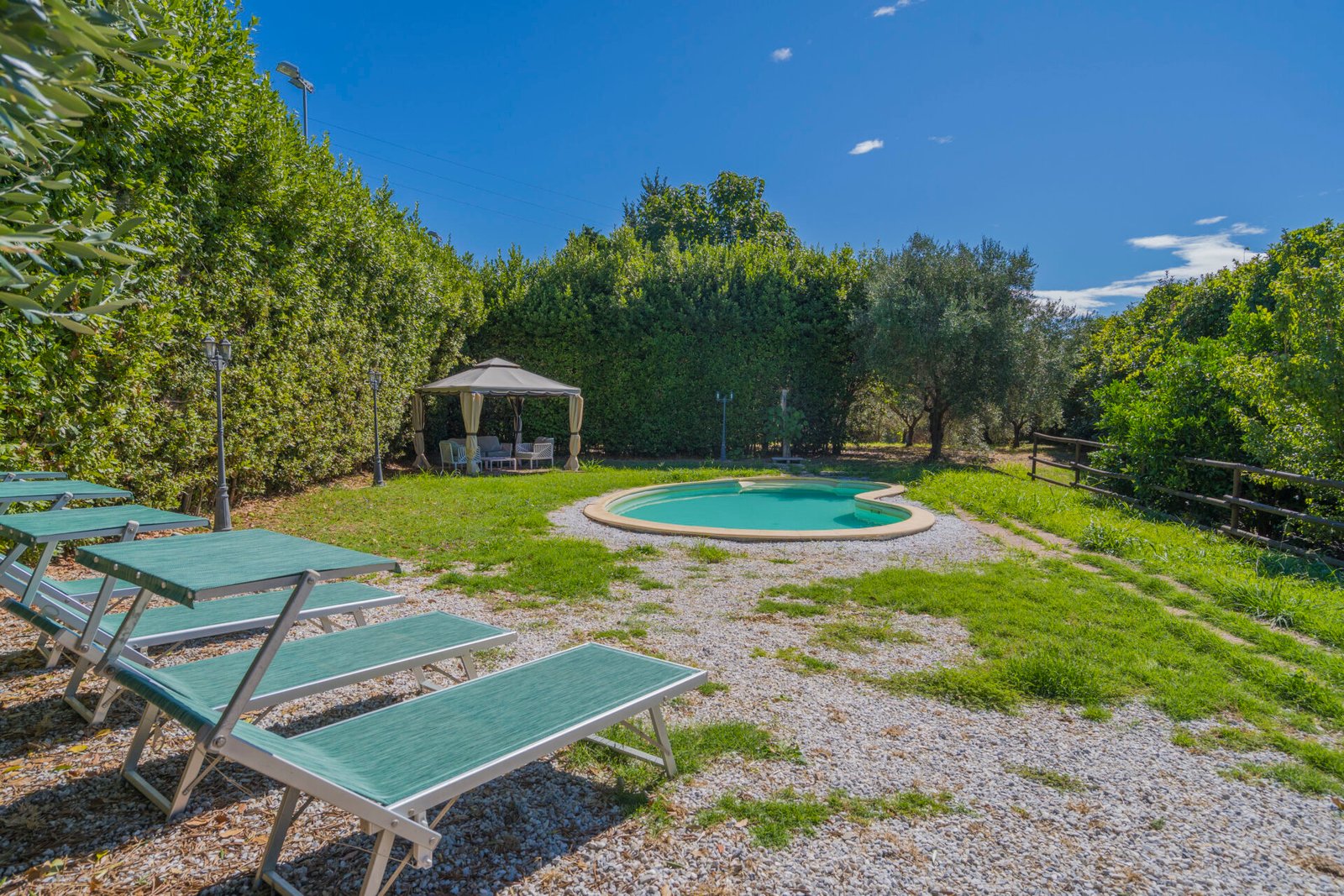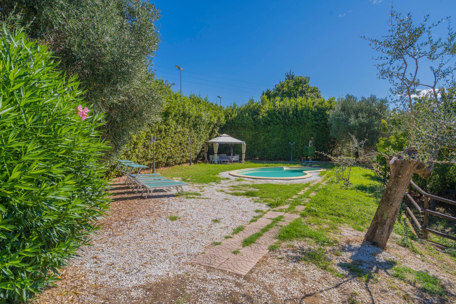 Un giardino/terrazza, appena fuori dalla porta della cucina, è attrezzato per mangiare all’aperto, mentre un altro giardino, molto più grande, è dotato di piscina (8×4 m, profondità 120 cm, aperta dal 1 giugno al 15 settembre) e gazebo arredato. C’è anche un uliveto e un frutteto.